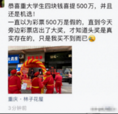 中彩票一夜暴富,一直以來大家以為是假的,但是近日重慶傳來一個好消息,一名重大學生用4元中了500萬,這一消息還被重慶多人轉發在朋友圈。