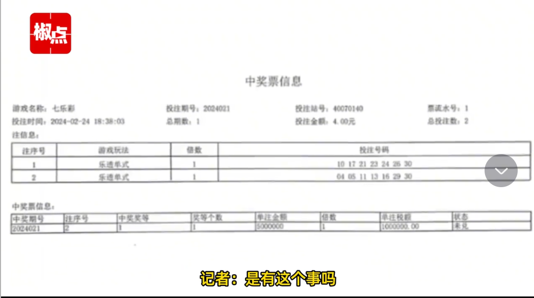 那到底是不是真的呢?3月2日,椒點視頻采訪了彩票店老板,彩票店老板表示,他們店確實是中了一個500萬的彩票。