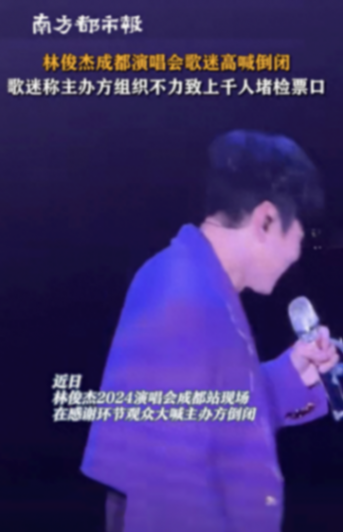 還有網友說在現場喊的超級大聲!真的很垃圾,9號檢票混亂,開場了觀眾還沒進場,10號坐在看臺看到內場的人淋雨,排隊拿雨衣還不夠發,看臺前排的人也淋雨但是無人管,大家把應援棒的塑料袋套頭上,搞到7點20才開場,太太太離譜,主辦倒閉!!JJ20第一個被喊倒閉的主辦方,甚至是在2024巡演首場成都,太拉垮了