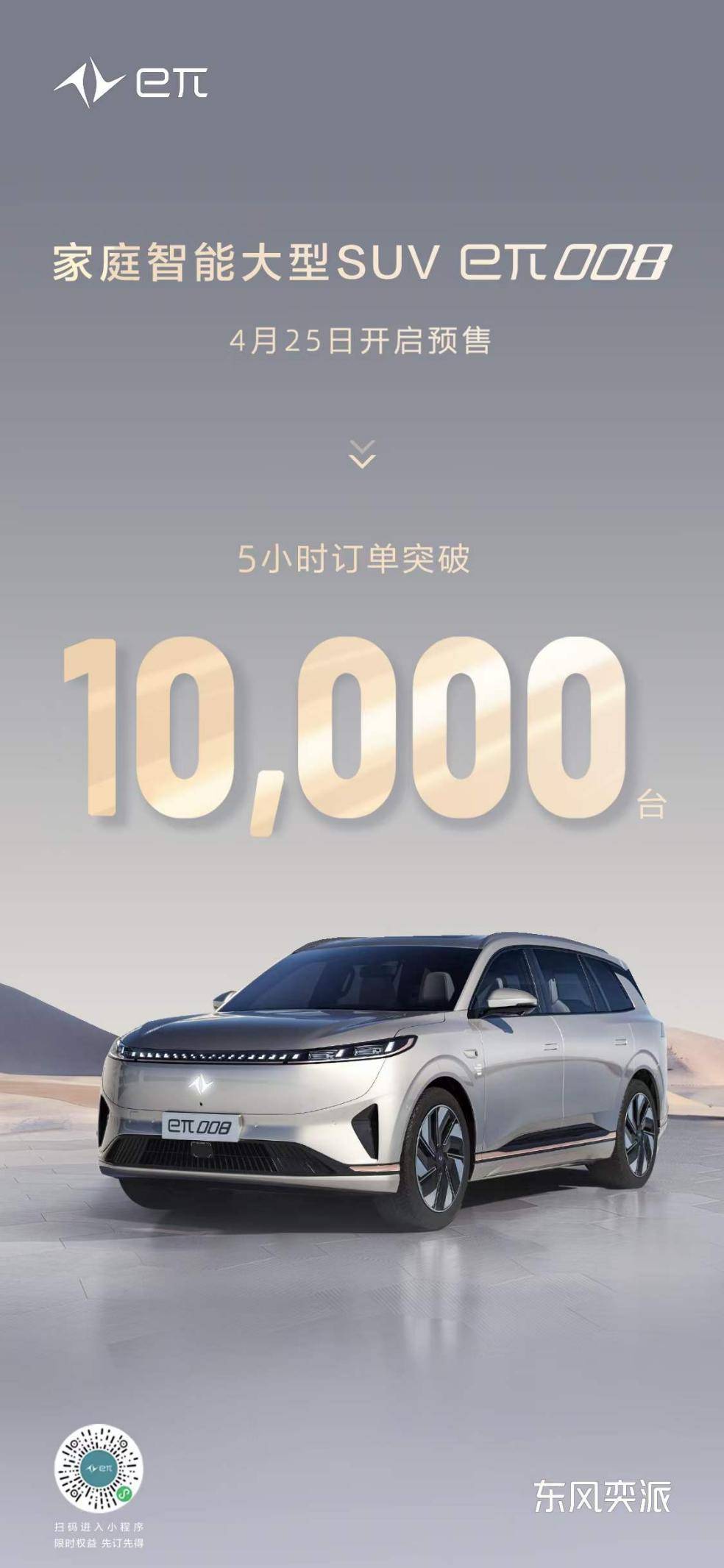 新車定位于家庭智能大型SUV,以硬核實力強勢進軍大六座SUV市場。它擁有5002mm車長+3025mm超大軸距的極致空間,提供純電&增程兩種動力選擇,在美感、智能、舒適、安全上,為家庭用戶打造一款真正的高價值精品新能源車,為用戶提供更理想的生活之選。eπ008預售政策同步揭曉,在4月25日至5月31日期間,99元下訂即享價值超10000元訂購福利。新車人氣火爆,開啟預售5個小時內訂單過萬。