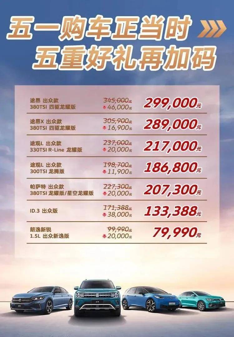 5月1日,上汽大眾官方推出購車優惠活動,官方降價至高4.6萬元,同時還提供以舊換新補貼,國家補貼至高1萬元,大眾補貼至高2萬元,活動時間為2024年5月1日至2024年5月31日。