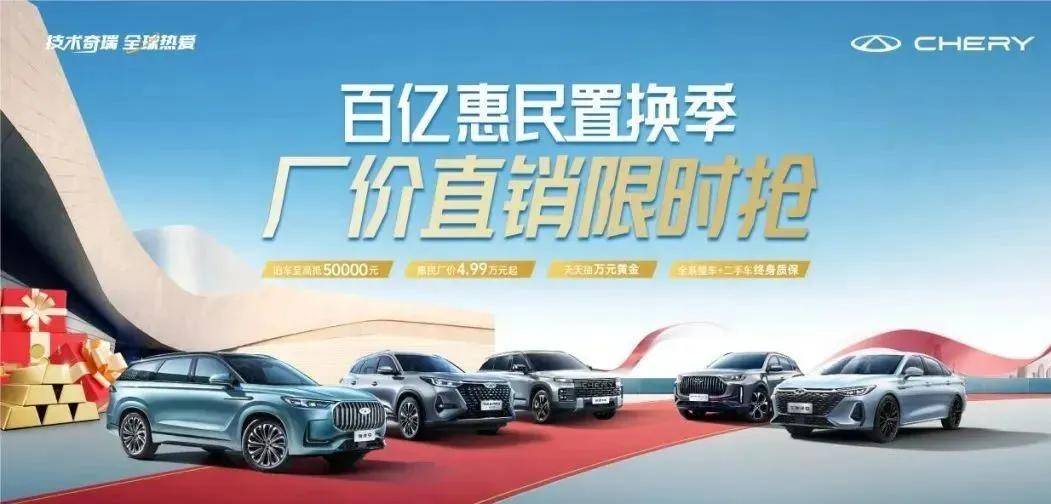 奇瑞汽車推出“百億惠民置換季 廠價直銷限時搶”活動,4月27日-5月31日期間,舊車不限車況、不限里程、不限年限,至高可抵5萬元。