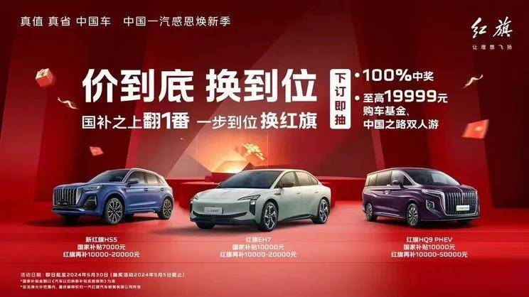 4月29日至6月30日期間,紅旗推出感恩煥新季,新款HS5享國家補貼7000元和企業補貼1-2萬元;紅旗EH7享國家補貼1萬元和企業補貼1-2萬元;紅旗HQ9 PHEV享國家補貼1萬元和企業補貼1-5萬元。