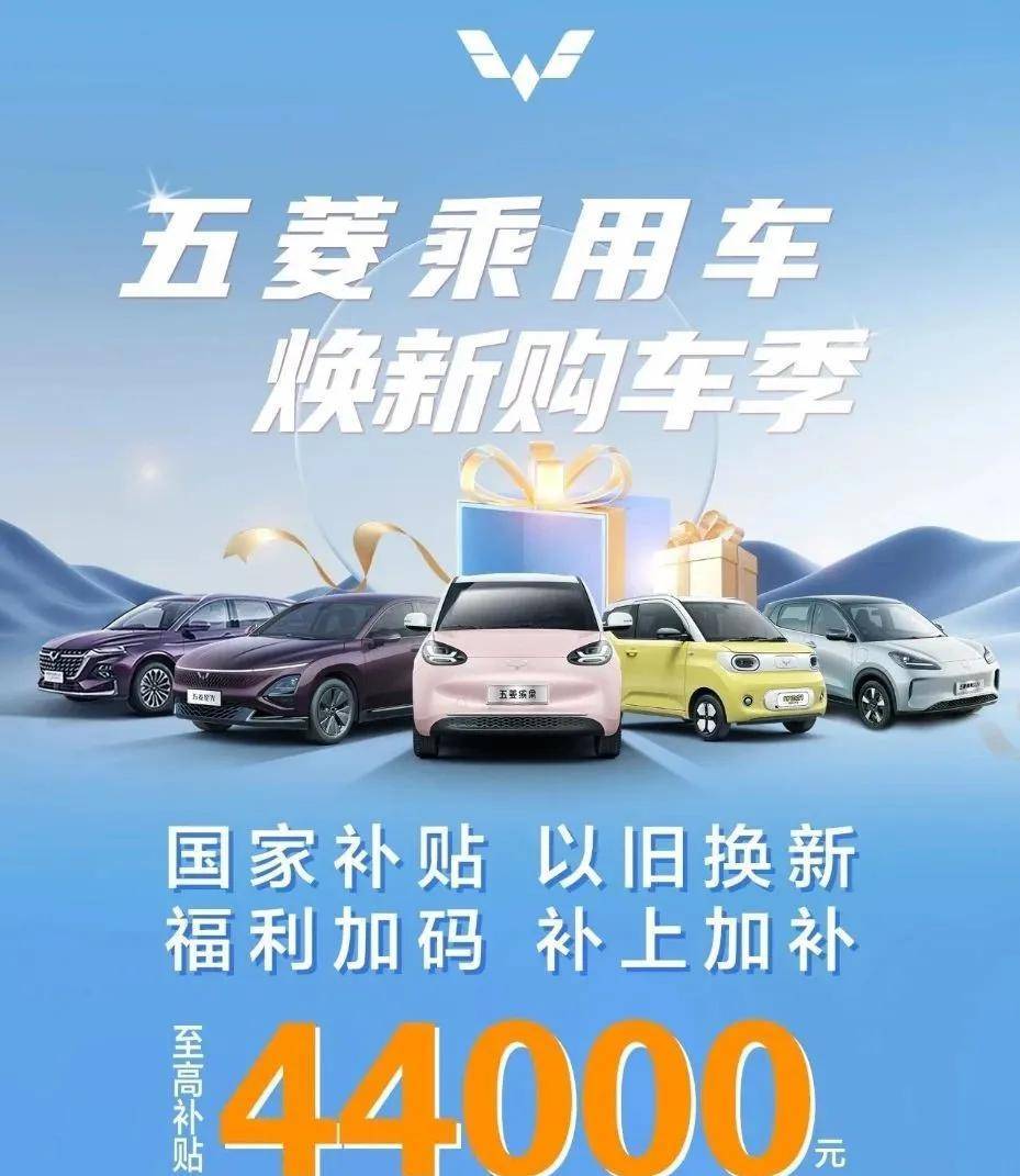 至2024年12月31日期間,五菱針對五菱星光、五菱繽果、五菱宏光MINIEV等9款車型,推出煥新購車政策,在滿足國補的前提下以舊換新,官方再提供專屬置換補貼,至高可達44000元。