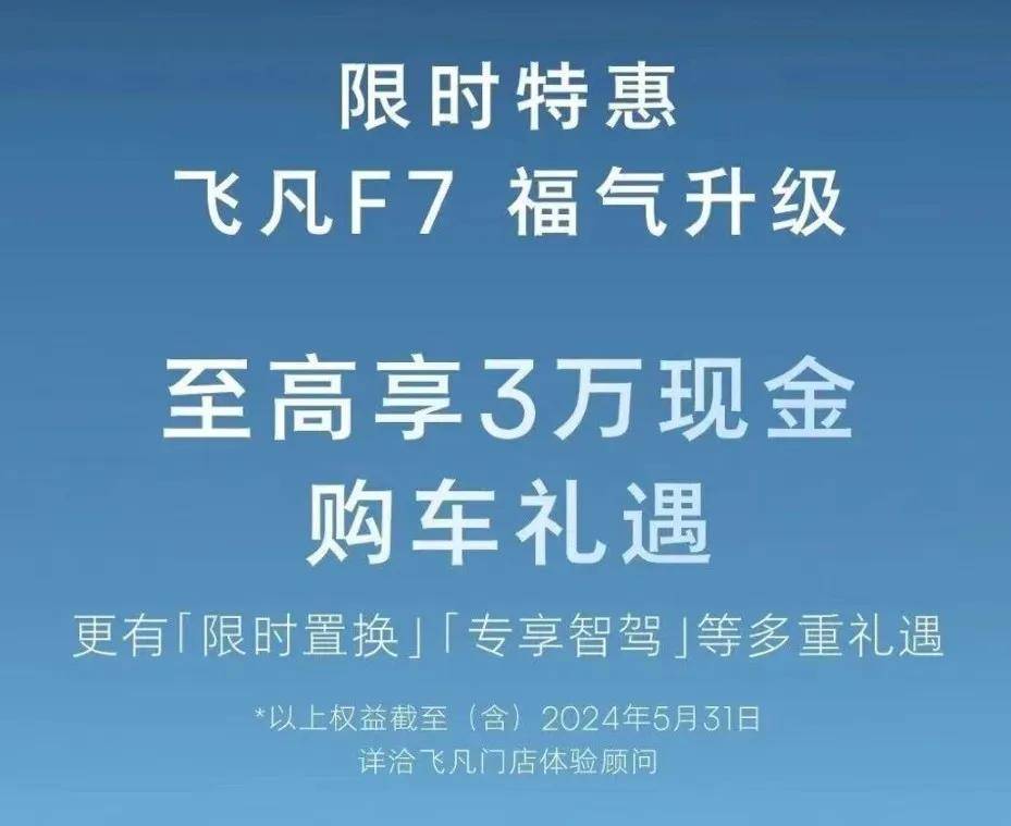 日前,飛凡F7推出至高享3萬元現金購車禮遇,同時還有限時置換、專享智駕等多重禮遇,以上權益截止到5月31日。