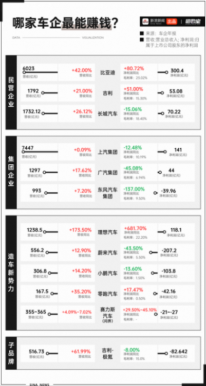 盡管營收增長,但凈利潤的增長并不樂觀。例如,廣汽集團在2023年的營收增長了17.48%,達到1287.57億元,但其凈利潤卻下降了45.08%,僅為44.28億元。長城汽車的毛利率下降了0.53個百分點,長安汽車下降了2.13個百分點,賽力斯下降了1.35個百分點。 對于新興的電動汽車制造商來說,情況更為嚴峻。蔚來、小鵬汽車和零跑汽車的凈虧損分別達到了211.47億元、103.8億元和42.16億元,其中蔚來和小鵬汽車的凈虧損同比有所擴大。