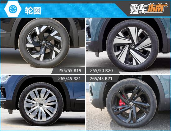 輪圈方面,2024款上汽大眾途昂出眾款提供三種尺寸輪圈。其中,兩款低配車型采用19英寸輪圈,匹配的輪胎規格為255/55 R19。380TSI 四驅龍耀版、530 V6 四驅龍耀版標配20英寸輪圈,匹配的輪胎規格為255/50 R20,還可以花2000元選裝21英寸輪圈。380TSI 四驅青峰龍耀版、380TSI 四驅龍祥版和530 V6 四驅龍祥版采用21英寸輪圈,匹配的輪胎規格為265/45 R21。
