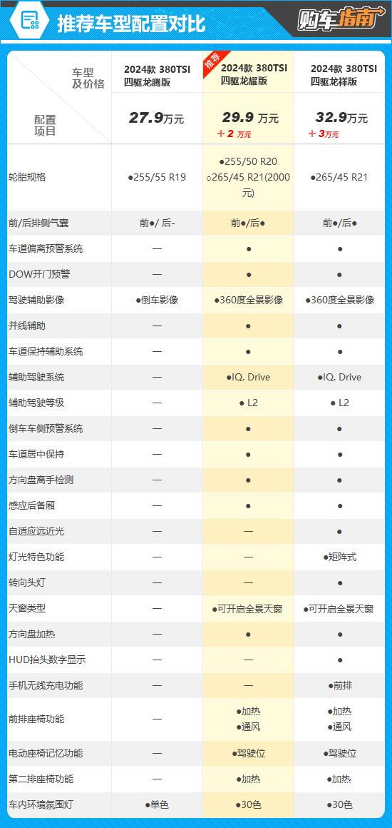 作為一款合資品牌中大型SUV,2024款上汽大眾途昂出眾款的目標客戶對車內舒適性和使用便利性有一定的要求。綜合來看,小編推薦廠商指導價為29.9萬元的380TSI 四驅龍耀版。相較低一級別的380TSI 四驅龍騰版,推薦車型在駕駛功能方面的提升非常明顯。同時,感應后備廂、可開啟全景天窗、方向盤加熱、前排座椅加熱/通風、第二排座椅加熱等配置,也會給日常用車帶來更好體驗。更重要的一點是,推薦車型的價格僅高出2萬元,絕對是物超所值。