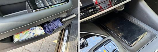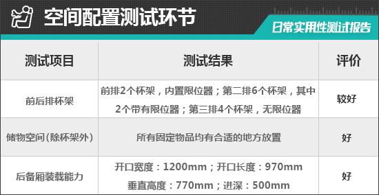 對于車內使用空間的測試,只針對前排觸手可及的空間,不包括手套箱、中央扶手箱等需開啟的空間。測試方法是將以下固定物品全部放置在前排的各個儲物空間內,通過固定物品的放置情況來判斷車輛儲物空間的表現。測試選定的固定物品為:2瓶常規大小的礦泉水、1部大屏手機、1支口紅、1個挎包、1副墨鏡、1把折疊雨傘以及1包常規尺寸的抽紙。