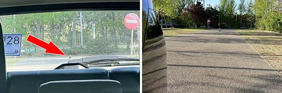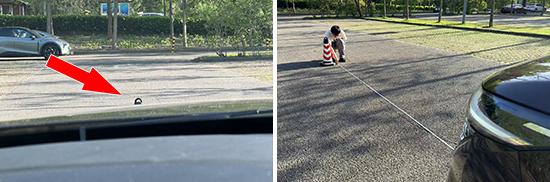 在測試前方視野環節,我們采用高70cm的樁桶作為參照物,隨后調整車距,直至在主駕駛位可以看到樁桶上沿。經過測試,樁桶與車頭最終測得的數據為4.5m,在測試過的同級別車型中處于下游水平。