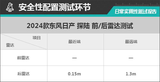 在測試過程中,倒車雷達最遠在1.3m處可感應到后方物體,持續蜂鳴階段距離為0.15m。參考往期測試經驗,持續蜂鳴階段越接近0.25m則越貼近日常使用習慣。從實測數據來看,評測車的持續蜂鳴提示距離與測試經驗值相差較大,在狹小區域泊車時需要特別注意。
