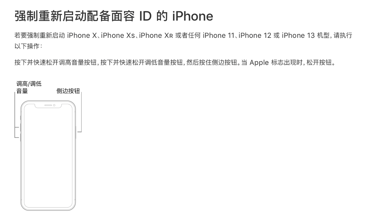 iPhoneX及后續(xù)機(jī)型的強(qiáng)制重啟方式,大伙們記住了:按下并快速松開調(diào)高音量按鈕,按下并快速松開調(diào)低音量按鈕,然后按住側(cè)邊按鈕。當(dāng) Apple 標(biāo)志出現(xiàn)時,松開按鈕。
