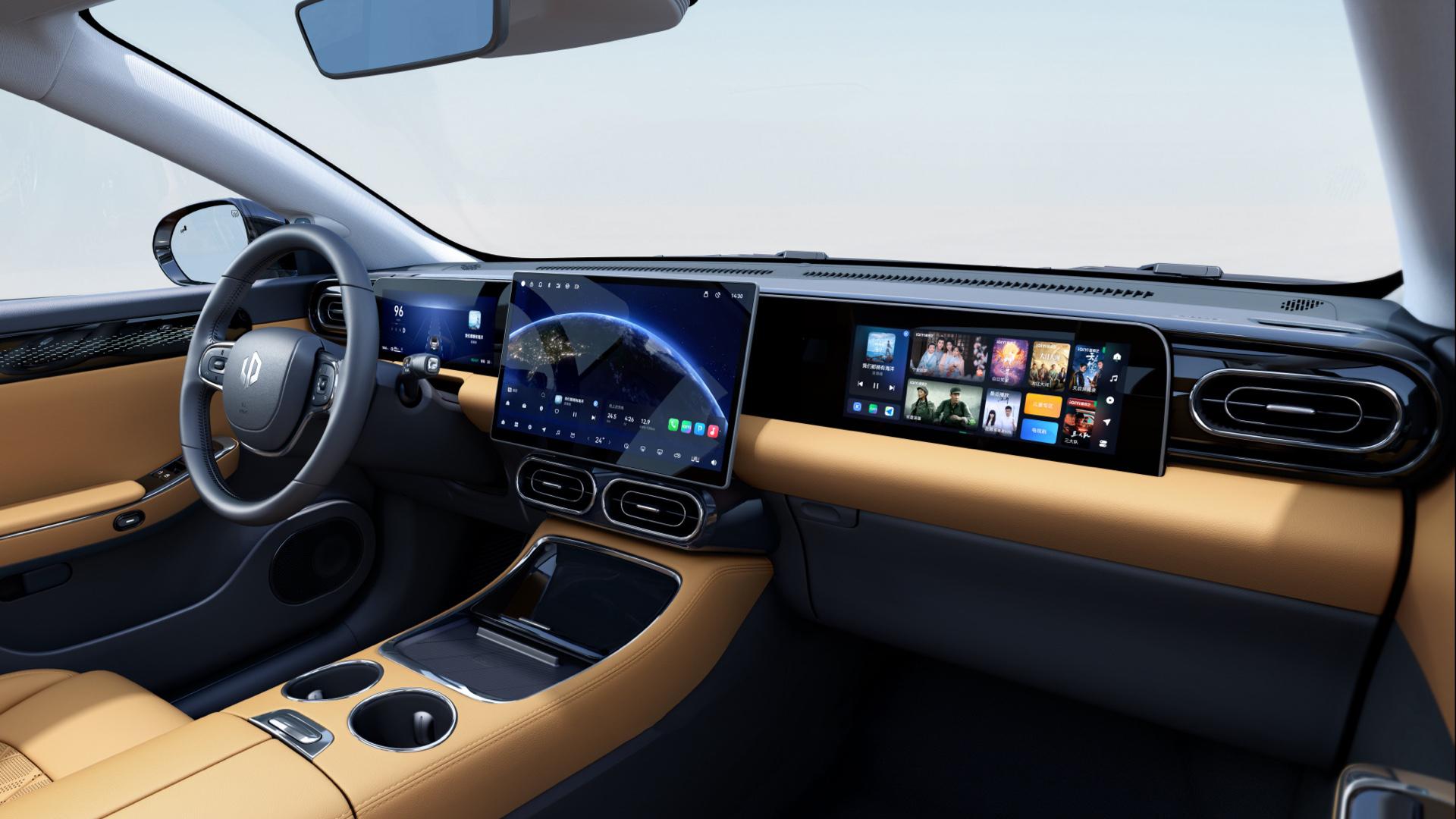 相比于外形,零跑C01的內飾就“正經”多了,全液晶儀表和副駕駛娛樂屏對稱分布在中控大屏兩側,方向盤也是圓形,并且引入了電子懷擋的設計,空調出風口采用了橢圓形設計,內飾看上去相對成熟,很多小伙伴可能都會喜歡。