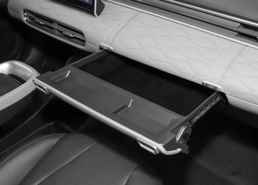 副駕駛前方的抽屜式儲物也非常有個性,內置了一些功能的區(qū)隔,并且還具備一定的拓展能力,點上一些東西就可以當個小桌板,日常的實用性會很不錯。