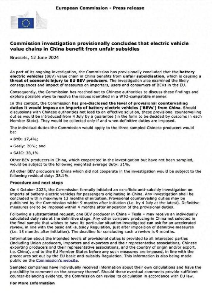 中方注意到,6月12日,歐委會發布關于對華電動汽車反補貼調查的初裁披露,擬對進口自中國的電動汽車征收臨時反補貼稅。歐方罔顧事實和世貿組織規則,無視中方多次強烈反對,不顧多個歐盟成員國政府、產業界的呼吁和勸阻,一意孤行,中方對此高度關切、強烈不滿,中國產業界對此深感失望、堅決反對。