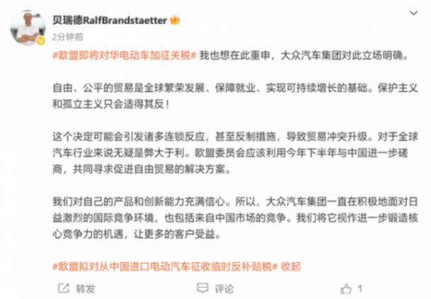 對此,中國商務部、外交部,中國汽車工業協會等表示強烈反對;包括梅賽德斯-奔馳、寶馬和大眾汽車等在內的德國汽車制造商,以及德國汽車工業協會也提出了嚴厲批評。