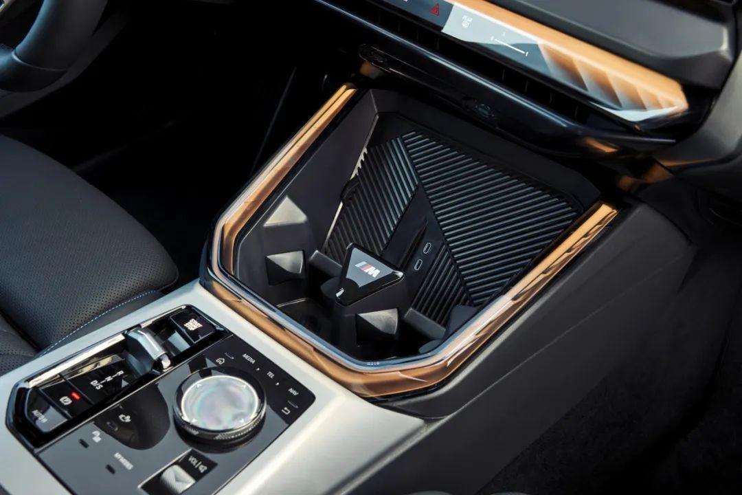 寶馬這次算是把氛圍燈玩出花了,中控臺(tái)下方也有一個(gè)“U”形設(shè)計(jì),里邊是杯架和無線充電板,內(nèi)部設(shè)計(jì)也和格柵相呼應(yīng)。檔把區(qū)域大家都很熟悉了吧?撥桿式的換擋、iDrive旋鈕以及My Modes模式等等,不知道后續(xù)能不能選裝水晶組件呢?