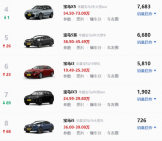 寶馬X5銷售7683輛,2月份以來的月銷量走勢相對平穩(wěn),在同價位上依然有較強的號召力;全新5系燃油版銷售6680輛,連續(xù)兩個月保持正增長趨勢,它的純電版i5銷售726輛,環(huán)比增幅接近一倍;寶馬iX3銷售1902輛,是近半年來月銷量新低。