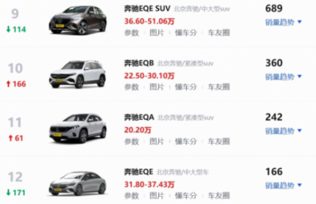 但是奔馳品牌銷量斷檔現(xiàn)象比較突出,從第五名開始月銷量直接到了一千多輛的水平,而且家族純電產(chǎn)品表現(xiàn)普遍較差,EQE SUV銷售689輛,EQB銷售360輛,EQA銷售242輛,EQE銷售166輛,相比寶馬純電產(chǎn)品差異較大,而且奔馳純電車并沒有針對熱銷燃油車進行開發(fā),這一點應該向?qū)汃R學習,比如C級和E級推出純電版,然后價格方面給出誠意。