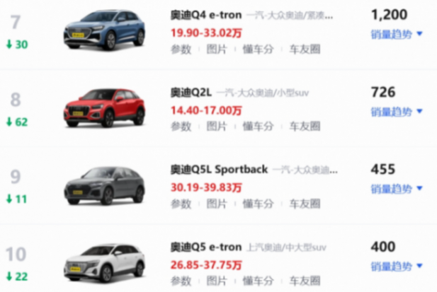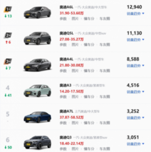 A3銷售4516輛,A7L銷售3252輛,Q3銷售3051輛,這幾款車就出現(xiàn)斷檔現(xiàn)象了,銷量差距跟前三名差距較大。而且現(xiàn)在很多消費者都在觀望,認為像A6L這種車肯定還得降價,而類似于A3、Q3等車型,同價位已經(jīng)有很多新勢力產(chǎn)品可以考慮,他們的競爭力下滑是比較嚴重的。