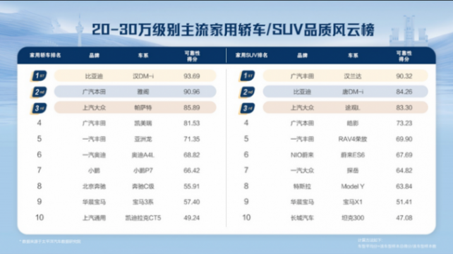 根據權威機構數據調研顯示,在20-30萬級別主流家用轎車品質風云榜中,漢DM-i以93.69的超高可靠性得分位居榜首,帕薩特得分僅85.89,位居第三。而在最直接反映用戶滿意度口碑的NPS消費者凈推薦值方面,漢DM-i的NPS高達97.2,服務的NPS高達97.1,遠超同級,大幅領先主流合資品牌。換言之,買合資燃油更可靠、更有品質也都是“老黃歷”了。