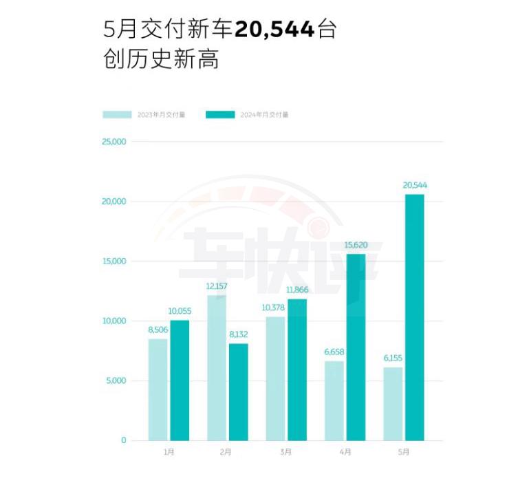 讓人沒想到的是,在經歷了1~4月的銷量低谷后,今年5月蔚來汽車的市場表現卻讓人刮目相看,銷量再創新高,賣了20544輛車。同比增長233.8%。環比增長31.5%。