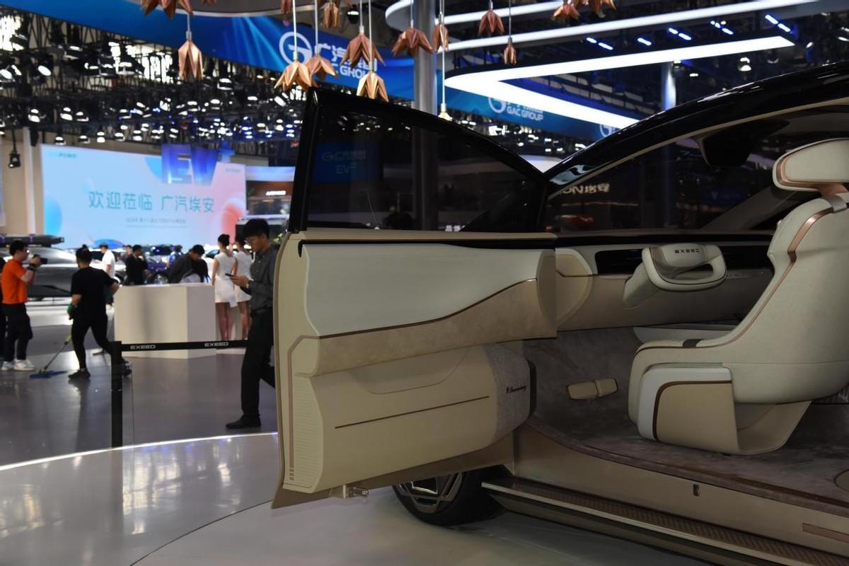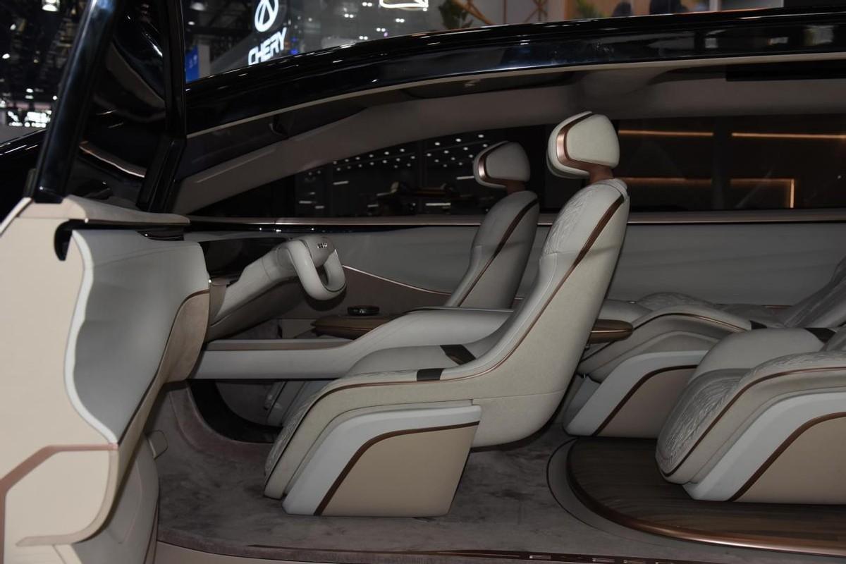從側(cè)身來看,車輛整個車身都是按照One Box的一體化概念打造的,懸浮式車頂全部采用黑色材料打造,烤漆支柱很好地隱藏了起來,A柱三角區(qū)布局了小尺寸后視鏡、車身上并沒有出現(xiàn)實際的車門把手,而輪轂則采用了超低風(fēng)阻的全封閉設(shè)計,配合側(cè)裙邊緣出現(xiàn)的一條由車尾延長而來的黑色裝飾帶,修長、科技、低風(fēng)阻是這臺車身上最顯著的元素風(fēng)格。