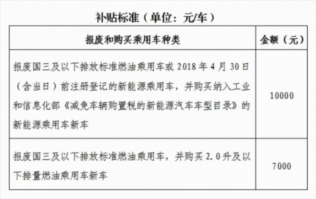 根據(jù)此前商務部、財政部等7部門聯(lián)合印發(fā)的《汽車以舊換新補貼實施細則》可知:“從通知印發(fā)至今年年底(12月31日),報廢國三及以下排放標準燃油乘用車或2018年4月30日前注冊登記的新能源乘用車,并購買符合節(jié)能要求乘用車的個人消費者,可享受一次性定額補貼,其中,對報廢上述兩類舊車并購買新能源乘用車的,補貼1萬元;對報廢國三及以下排放標準燃油乘用車并購買2.0升及以下排量燃油乘用車的,補貼7000元”。