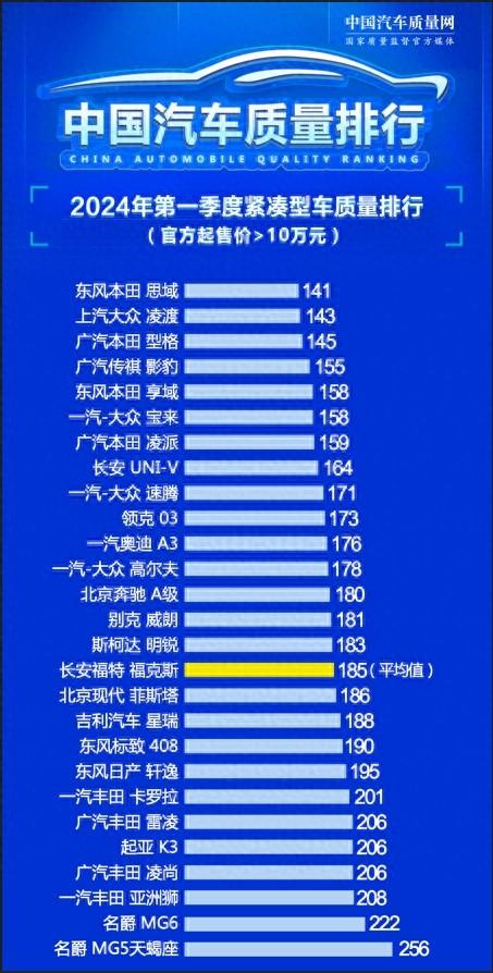 從榜單上可以看到,此次質量測評的平均分為185分,分數越小,代表車型的質量越好。其中,排名第一的車型是東風本田思域,這一車型質量評分為141分,姜還是老的辣,本田做品控還是很給力。