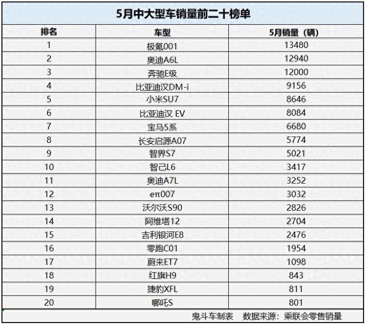 為了看得更為清楚,鬼哥根據乘聯會發布的5月零售銷量數據,整理出中大型車市場排名前二十的榜單,看看誰才是市場中的“黑馬”,誰更受歡迎?