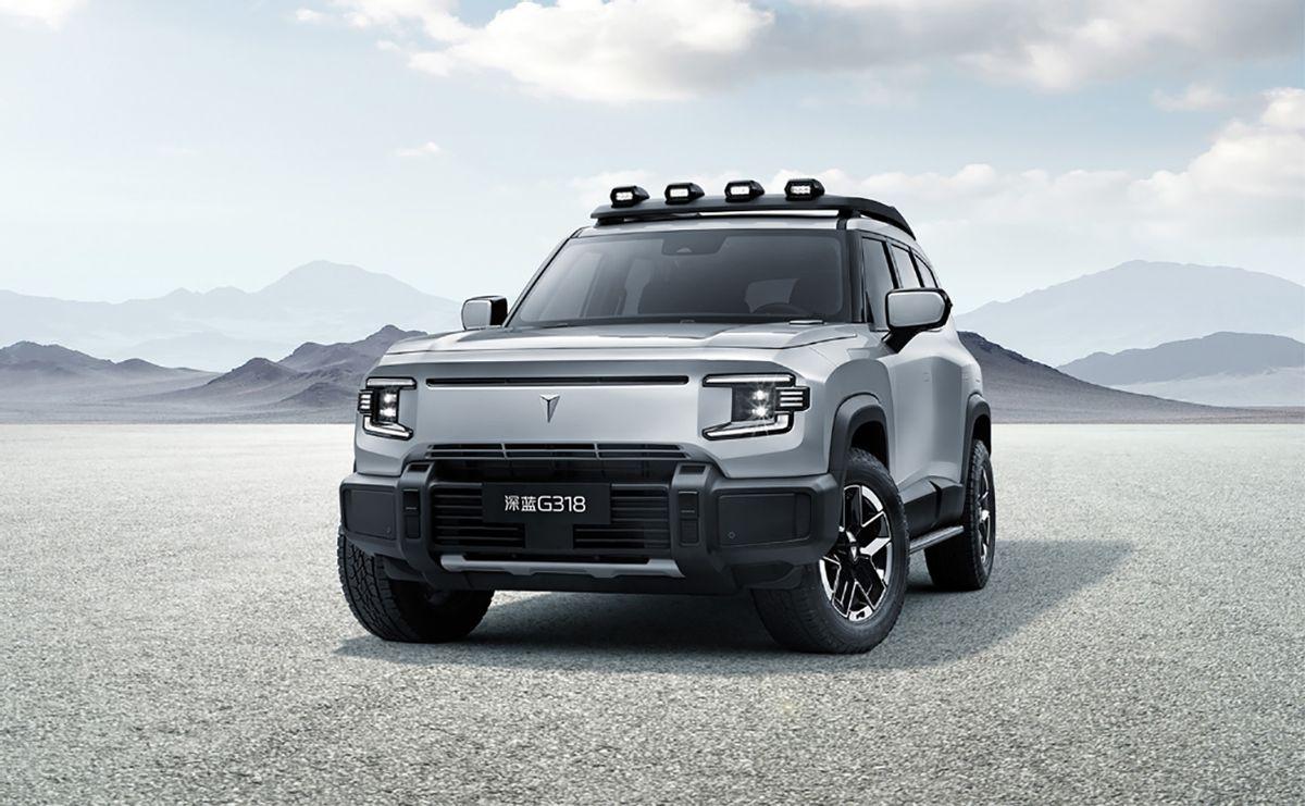 G318主打硬朗設計,車頭配備C字型大燈和寬厚前包圍,車頂還配有探照燈。車身側面線條平直,配備加寬越野護板,可選原廠AT輪胎。車尾采用敦實厚重的包圍造型和全尺寸外掛備胎,頂配車型還有電吸尾門。內飾方面,深藍G318延續硬派越野風格,中控臺造型厚實,配備大量實體按鍵、寬厚擋把和鏤空扶手,方便操作。搭載10.25英寸液晶儀表和14.6英寸中控屏。動力方面,深藍G318搭載1.5T增程式動力系統,單電機版最大功率185kW,最大扭矩310N·m;雙電機四驅版系統總功率316kW,最大扭矩572N·m。