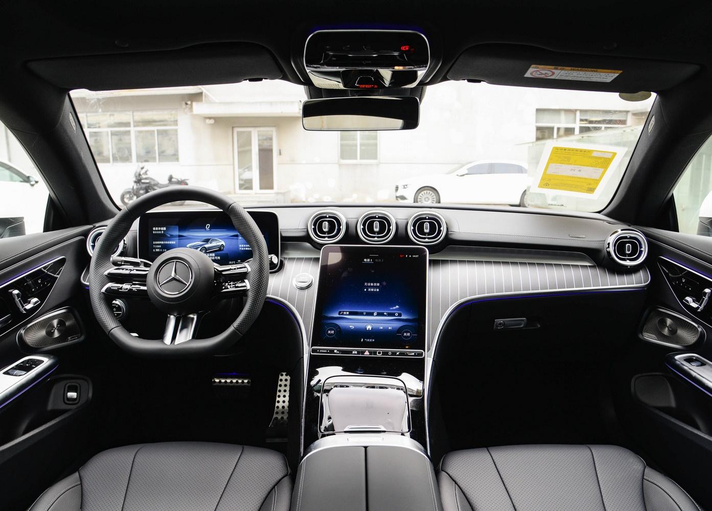 進入車內,新車內飾整體很高級,平直的中控臺部分依舊是經典的家族式造型設計,經典的空調出風口很精致,大面積的豎紋飾板鑲嵌,結合多色的氛圍燈設計,檔次感也是很出色,懸浮式的大尺寸液晶儀表,結合中央內嵌式的中控大屏,科技感也是有所提升。并配備第三代MBUX人機交互系統。