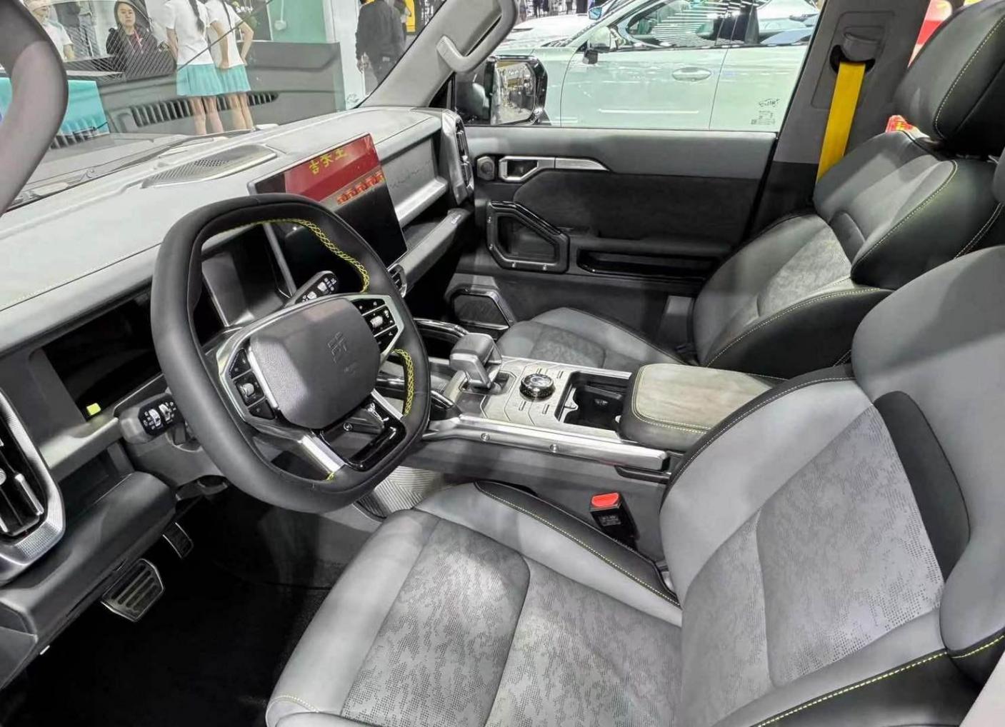進入車內(nèi),新車整體采用了對稱式設計,簡潔大方,全液晶儀表和15.6英寸的中控屏顯得科技感十足。而且,內(nèi)置的高通驍龍8155芯片確保了車輛的智能化體驗,并且車內(nèi)多條棱角分明的線條設計更是呼應了車身外觀的硬朗定位,而上下扁平的多功能方向盤,結合游艇式電子擋把也是讓新車駕駛起來手感更出色。