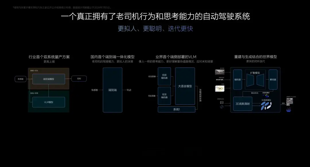 7月初,理想汽車召開智能駕駛發布會,宣布推送分段式端到端無圖NOA,并發布了“本土首個”一體式端到端方案,并且“行業首創”端到端+視覺語言模型的雙系統方案。