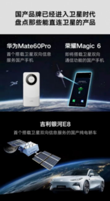 除了汽車,如果國產(chǎn)手機(jī)的衛(wèi)星通訊也在加速布局。比如之前發(fā)布的華為Mate60Pro,榮耀的Magic 6都搭載了衛(wèi)星的雙向通訊功能。銀河E8也是國產(chǎn)車中第一款待宰衛(wèi)星雙向通信的國產(chǎn)新能源汽車。