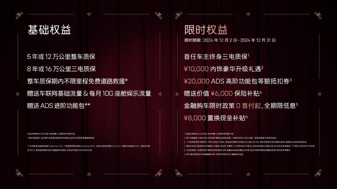 同時,阿維塔還推出了多項購車禮遇,2024年12月31日前大定用戶可享六大限時權益:首任車主終身三電質保、10000元內飾豪華升級禮遇、20000元ADS高階功能包等額抵扣券、價值6000元的保險補貼、0首付起全期限低息、8000元置換現金補貼。