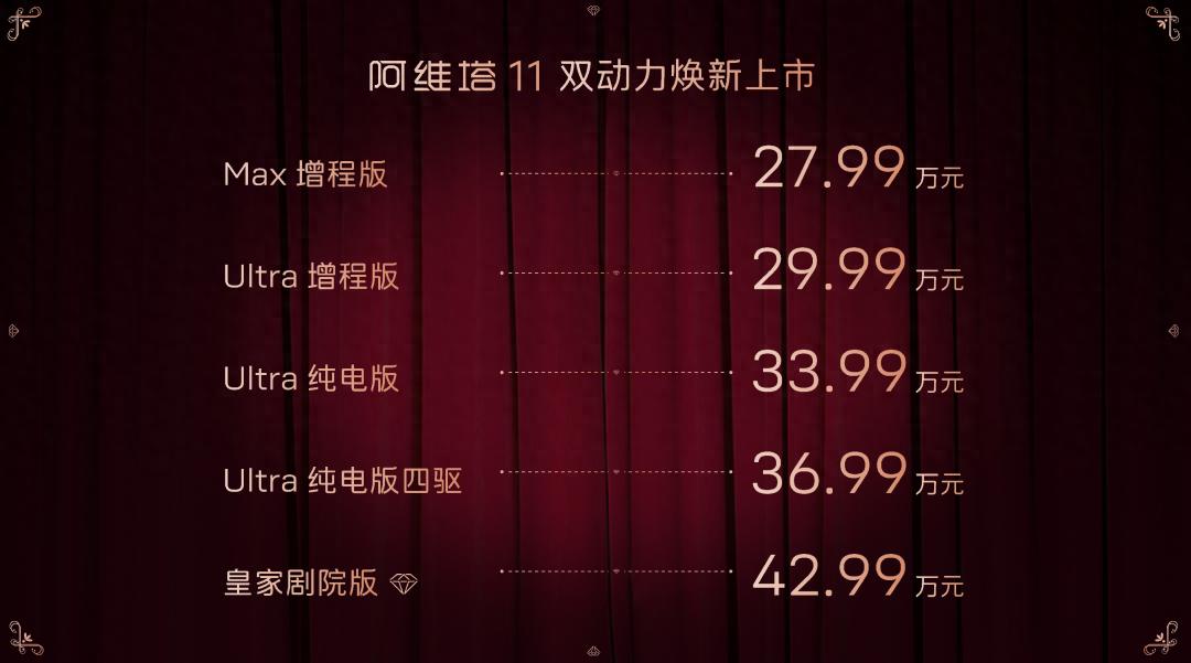 新車共推出兩種動力五款車型,官方售價分別為:Max增程版27.99萬元、Ultra增程版29.99萬元、Ultra純電版33.99萬元、Ultra純電版四驅36.99萬元、皇家劇院版42.99萬元。新款車型上市即交付。