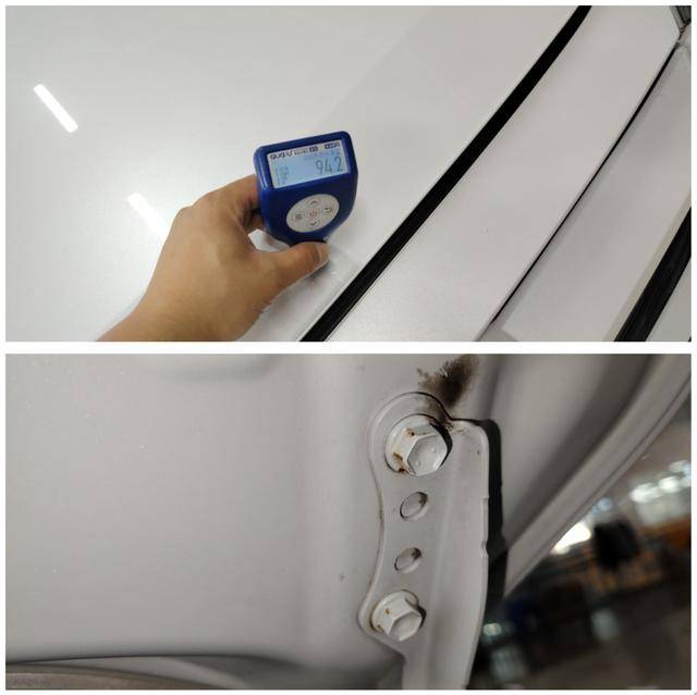 用漆膜儀測(cè)量機(jī)蓋漆面為原漆狀態(tài),打開(kāi)機(jī)蓋后可以看到前蓋固定鉸鏈雖然有輕微銹蝕,但可以確定沒(méi)有拆卸過(guò)。