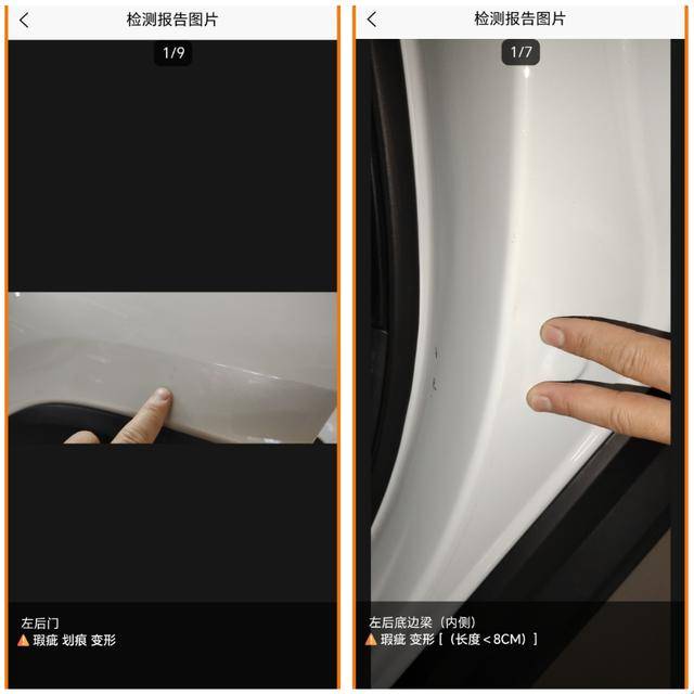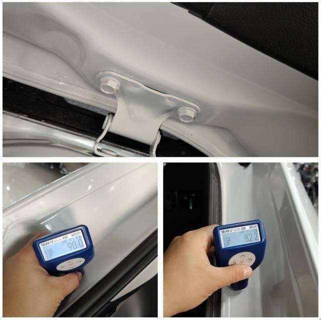 用漆膜儀把車輛左側(cè)全部打了一遍,ABC柱全都沒(méi)有問(wèn)題,左后門有輕微變形和肉眼可見(jiàn)的漆面瑕疵;另外,左后底邊梁內(nèi)側(cè)有一處變形,大概率是關(guān)門夾到什么硬的東西導(dǎo)致的,不過(guò)好在長(zhǎng)度小于8cm,問(wèn)題不大。