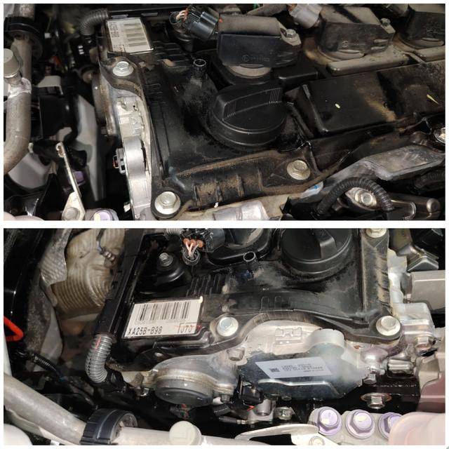 再回到機(jī)艙檢查發(fā)動(dòng)機(jī),從機(jī)艙上部看倒是沒(méi)有發(fā)現(xiàn)拆卸維修痕跡,但是氣門室蓋和前端蓋都有油漬油泥,這狀態(tài)在5萬(wàn)多公里的豐田車上,真心不該出現(xiàn)啊!