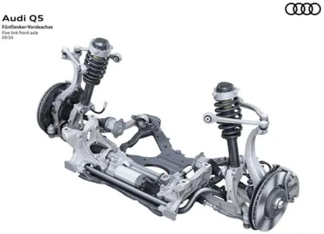 在底盤(pán)方面,新款?yuàn)W迪Q5將采用標(biāo)準(zhǔn)的舒適化調(diào)校,前后懸掛結(jié)構(gòu)均為五連桿,前懸結(jié)構(gòu)從雙叉臂設(shè)計(jì)升級(jí)而來(lái),上臂一分為二的設(shè)計(jì)能將路面的顛簸化解得更為細(xì)膩,相比上一代在舒適性上有進(jìn)一步提升。根據(jù)目前官方的說(shuō)法,后期用戶(hù)還可選裝運(yùn)動(dòng)型的懸架結(jié)構(gòu),并配有FSD系統(tǒng),在快速過(guò)彎時(shí)能為車(chē)身提供充足的側(cè)向支撐。