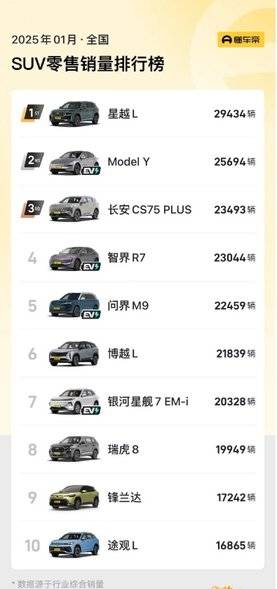 1月SUV零售銷量排行榜,第一名星越L,銷量29434輛;第二名Model Y,銷量25694輛;第三名長安CS75 PLUS,銷量23493輛;第四名智界R7,銷量23044輛;第五名問界M9,銷量為22459輛。