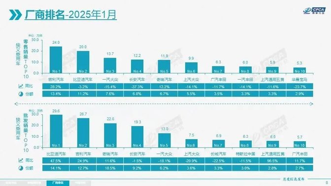 也就是說,2024年一直是銷量第一的比亞迪汽車,2025年1月份銷量同比竟然出現了下滑,還被吉利汽車超越了,不過,批發量數據來看,還是比亞迪第一,主要是比亞迪國內+海外銷量高,但國內銷量沒吉利汽車高。