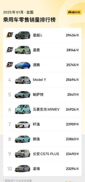 1月乘用車零售銷量排行榜:第一名星越L,銷量29434輛;第二名星愿,銷量28246輛;第三名速騰,銷量25745輛;第四名Model Y,銷量25694輛;第五名帕薩特,銷量25411輛。