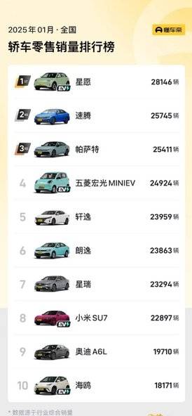 以前轎車排行榜冠軍,比亞迪旗下車型經常拿下,例如我們熟悉的海豚和海鷗,2025年1月轎車冠軍被星愿奪取,比亞迪海鷗僅排在第十名,銷量為18171輛,比星愿低了將近10000輛。