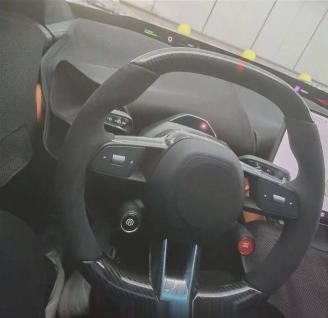 雖說車標等一系列細節被遮擋,但明眼人一看99%就是YU7。方向盤上依舊出現了有關駕駛模式調節和輔助駕駛的旋鈕,與SU7不同的是YU7的方向盤材質方面加入了碳纖維和翻毛皮材質,主打一個高性能方案。