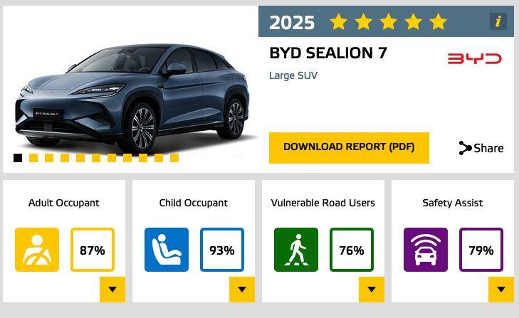 歐洲Euro NCAP對比亞迪Sealion 7在兒童乘員保護方面給予了很高的評價,澳洲ANCAP同樣共享信息,得分率達到了93%,是歐洲Euro NCAP更新碰撞規則后最高評分。
