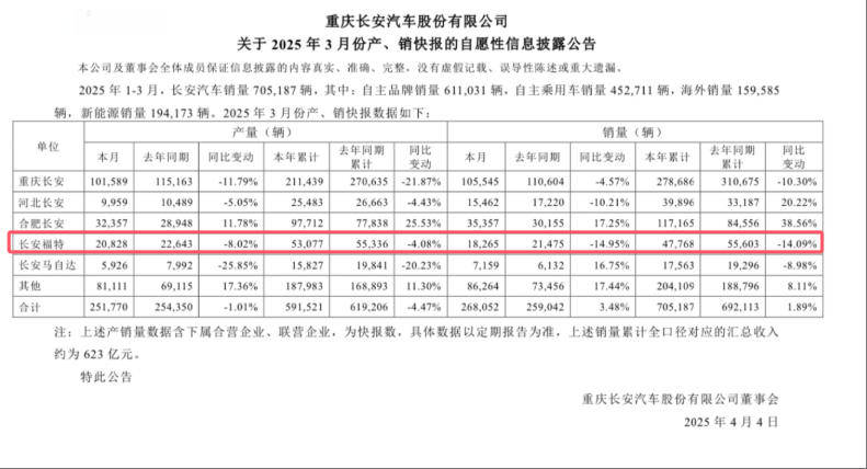 來自長安汽車的產銷快報顯示,長安福特今年3月份銷量僅有18,265輛,同比下滑14.95%,這也是長安福特進入2025年后連續3個月銷量同比下滑。而受此影響,長安福特今年一季度銷量也僅有4.78萬輛,同比降幅達14.09%。