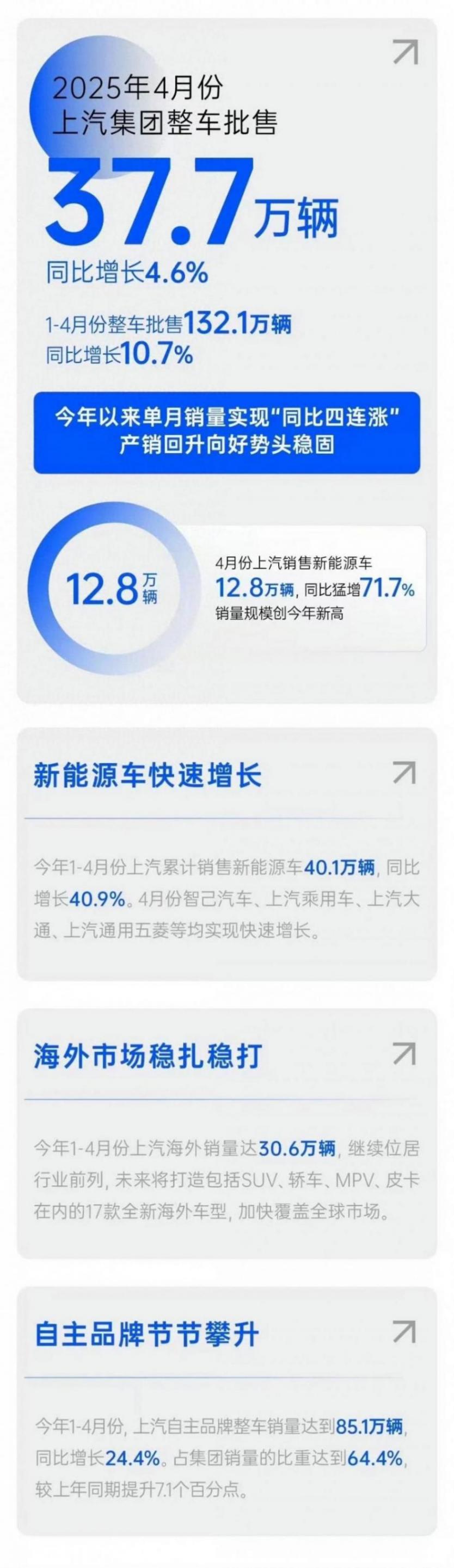 在汽車產(chǎn)業(yè)加速變革的當下,車企的競爭格局正經(jīng)歷深刻重構。上汽集團憑借新能源賽道的爆發(fā)式增長、自主品牌的強勢崛起以及全球化戰(zhàn)略的深化布局,交出了一份亮眼的成績單:1-4月累計銷量達132.1萬輛,同比增長勢頭強勁,尤其在新能源領域以71.7%的同比增幅展現(xiàn)出領跑行業(yè)的潛力。這份成績單背后,是技術、產(chǎn)品與戰(zhàn)略協(xié)同共振的成果,更預示著中國汽車工業(yè)向價值鏈高端攀升的新范式。