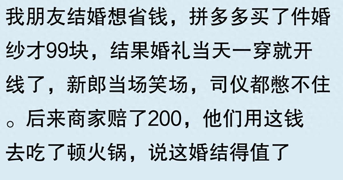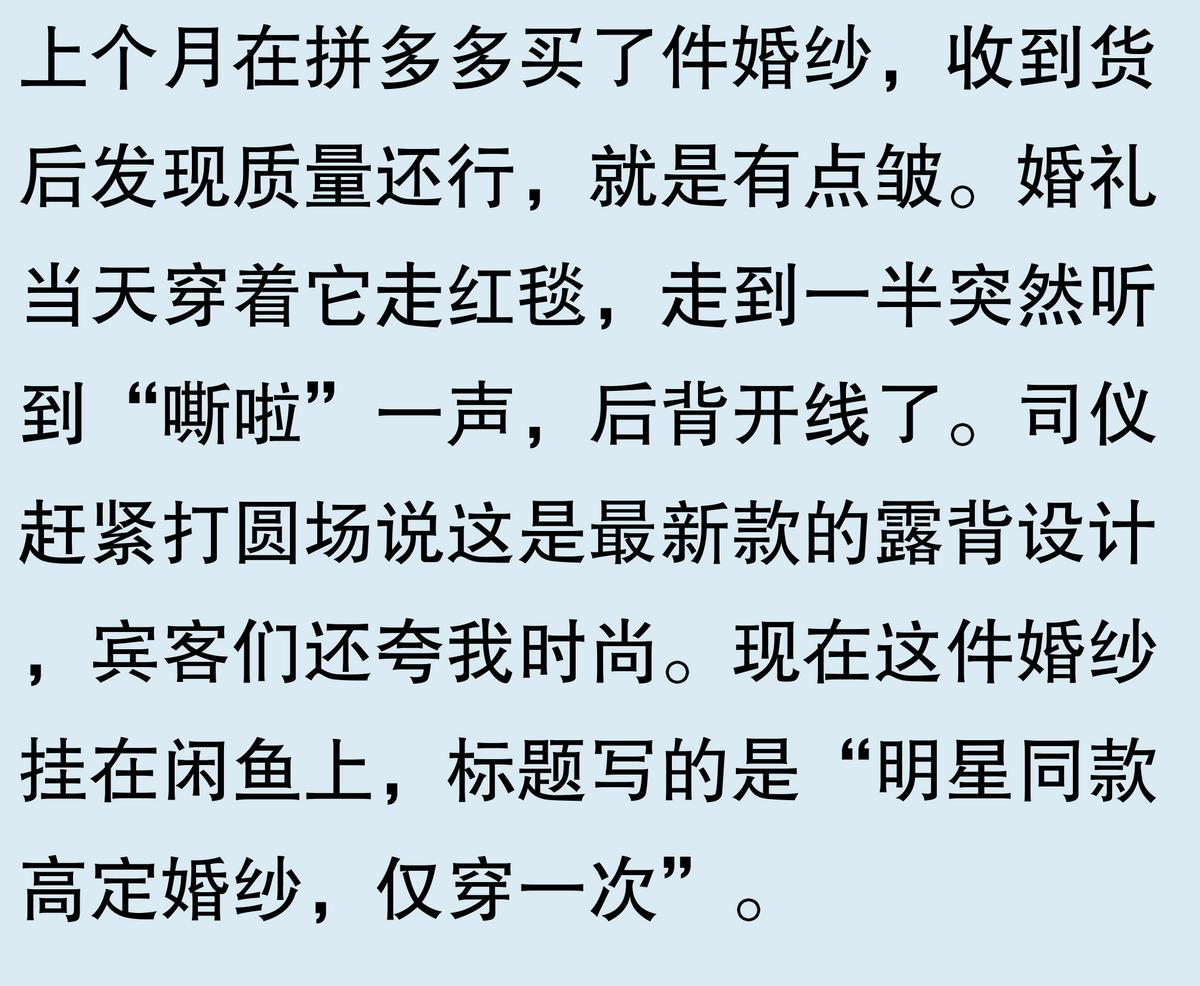 我閨蜜結婚為了省錢在拼多多買了件婚紗,結果收到貨發現是蚊帳改的,氣得她當場要退貨。她老公說將就穿吧反正就穿一次,結果婚禮當天她走路被裙擺絆倒三次,敬酒時還被服務員當成了裝飾用的白紗簾。